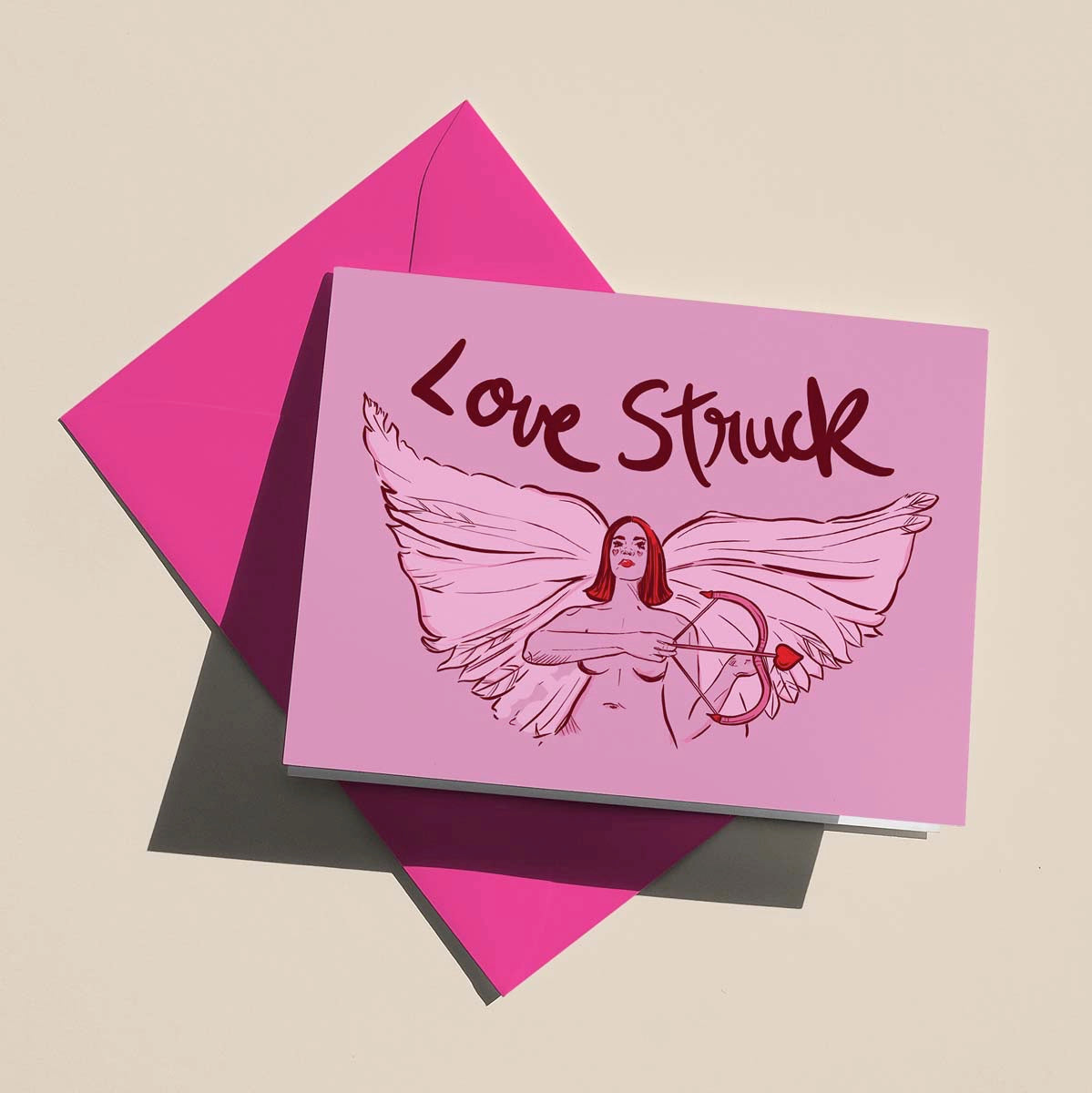 Love Struck features a woman holding a bow and heart-tipped arrow. The perfect Valentine’s card for crushes, partners, and big soft feelings.