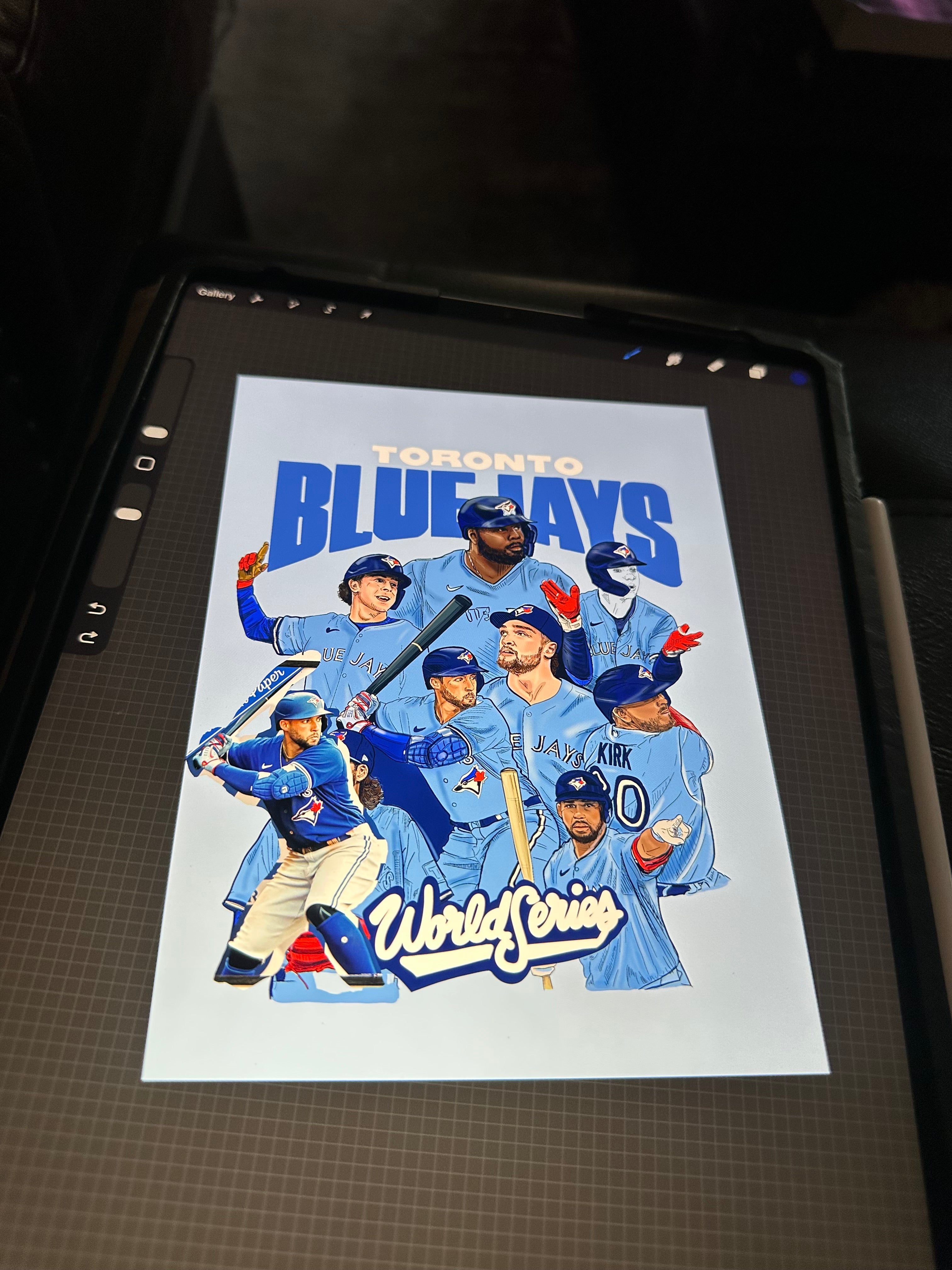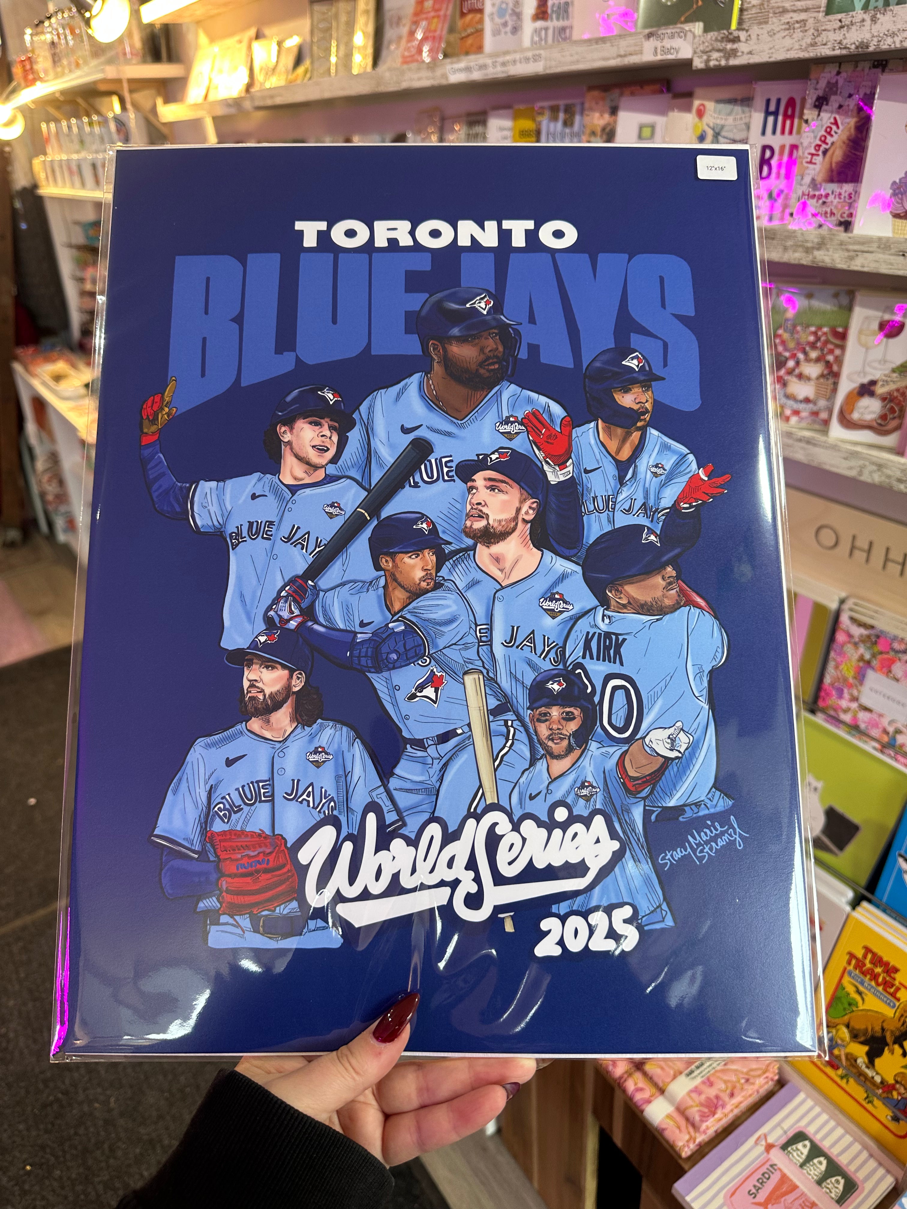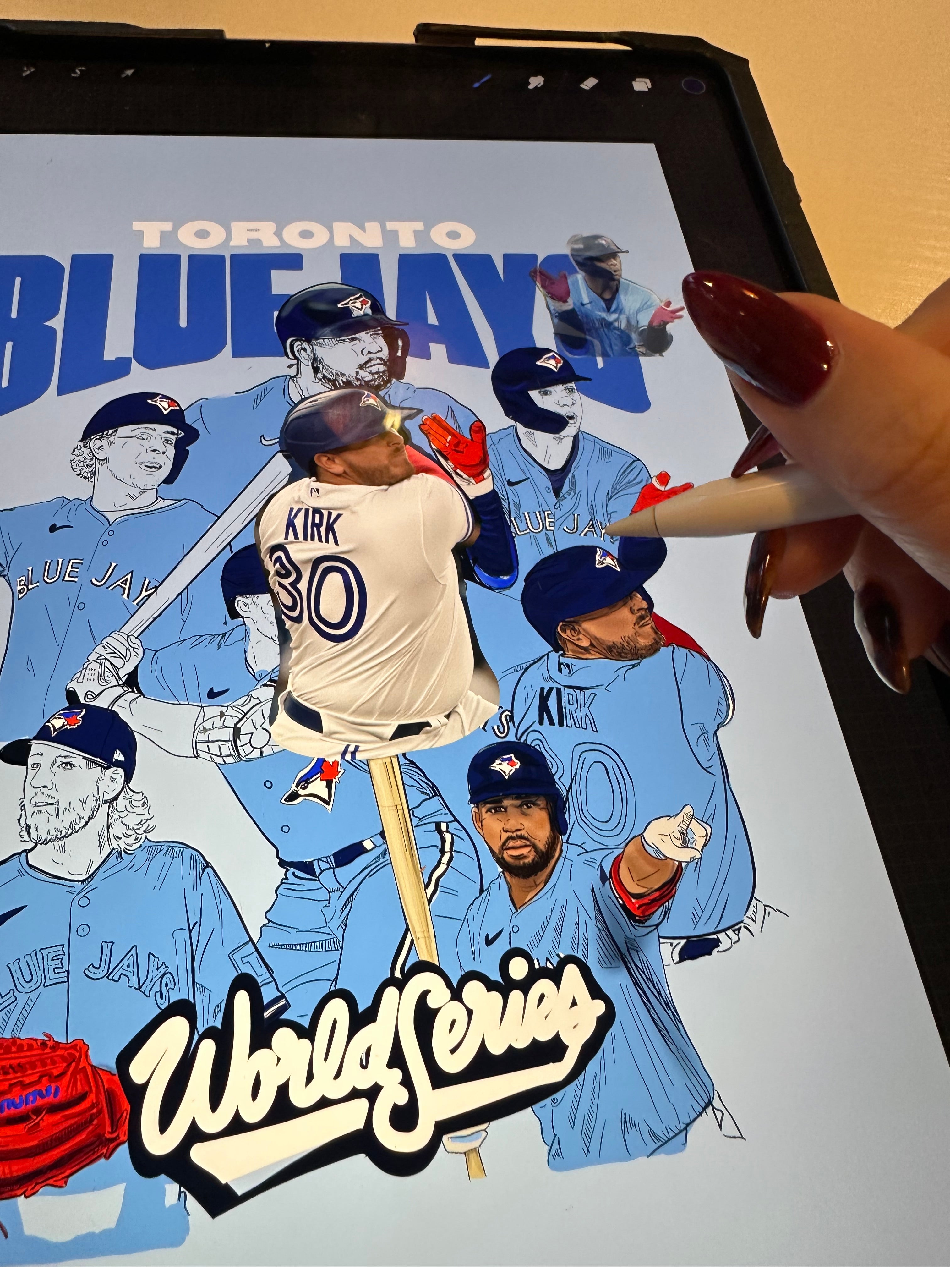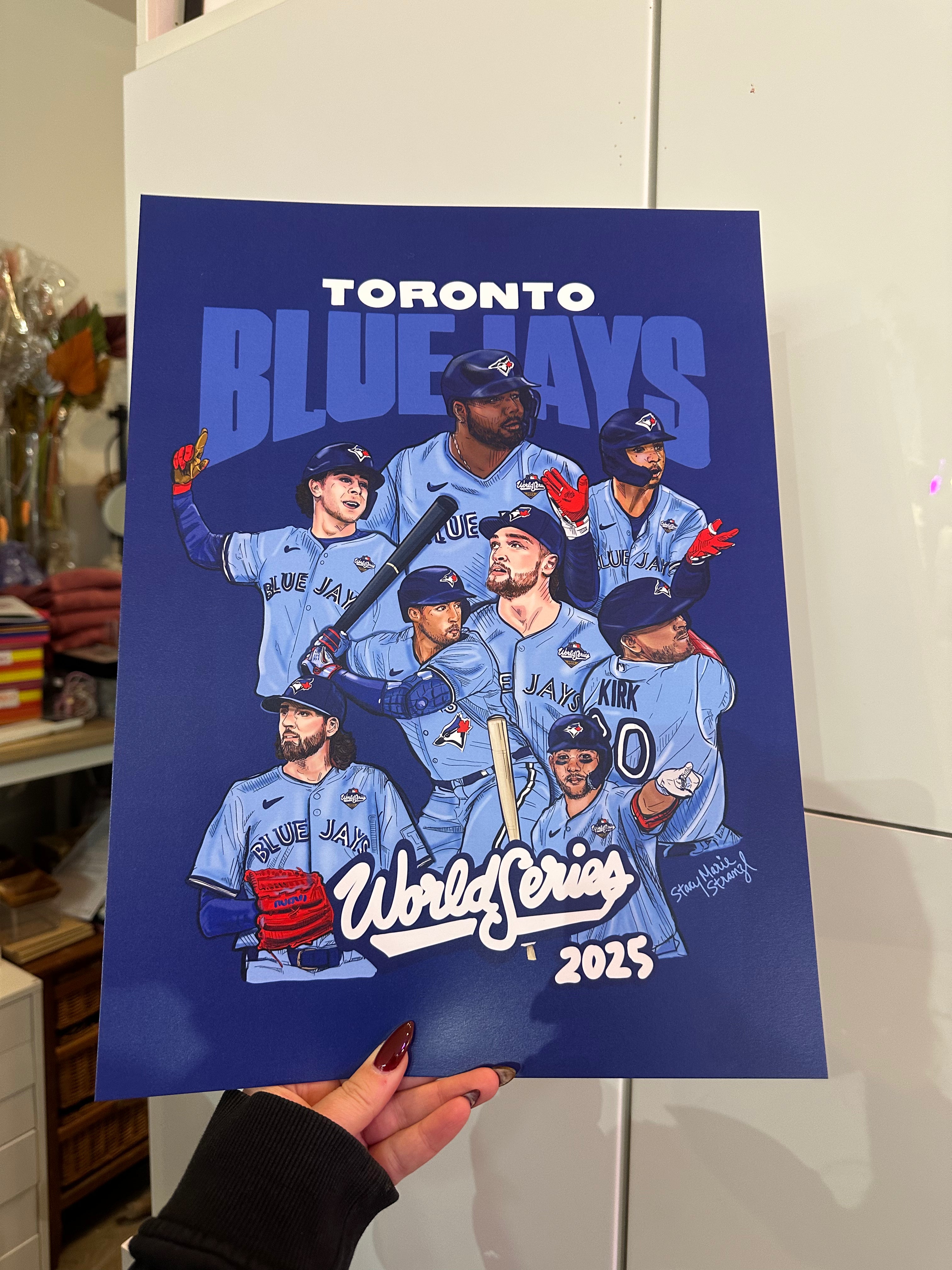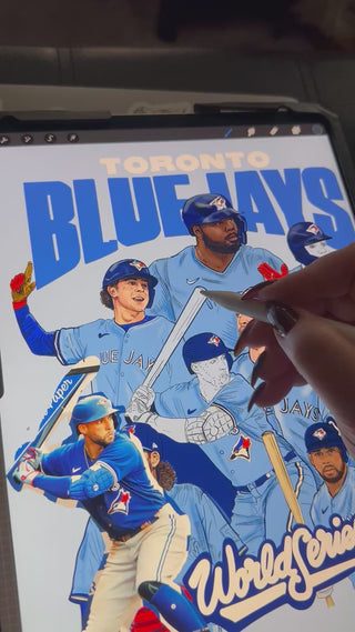 Pre-order this commemorative poster is completely illustrated by hand on my tablet with a digital pencil. Features Vladimir Guerrero Jr, Ernie Clement, Andrés Giménez, Trey Yesavage, Alejandro Kirk, Kevin Gausman, George Springer and Bo Bichette of the Toronto Blue Jays. Comes in one size, 12”x16”. Go Jays Go!