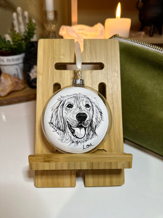 Get a pet or loved one illustrated on a keepsake that can be enjoyed year round. Approx 3" glass bulb with flat back is primed, hand-drawn, sealed and strung with ribbon.